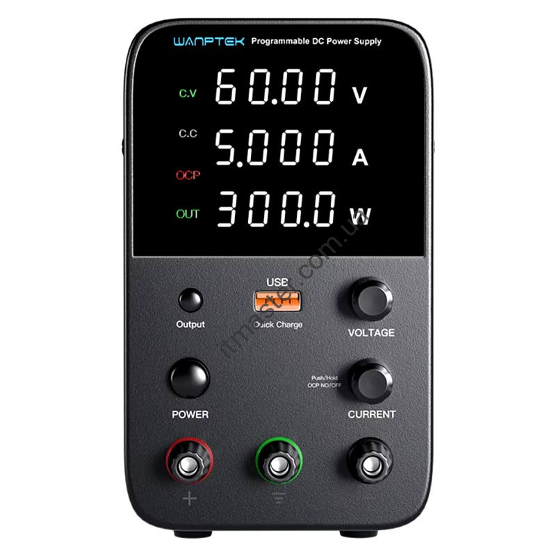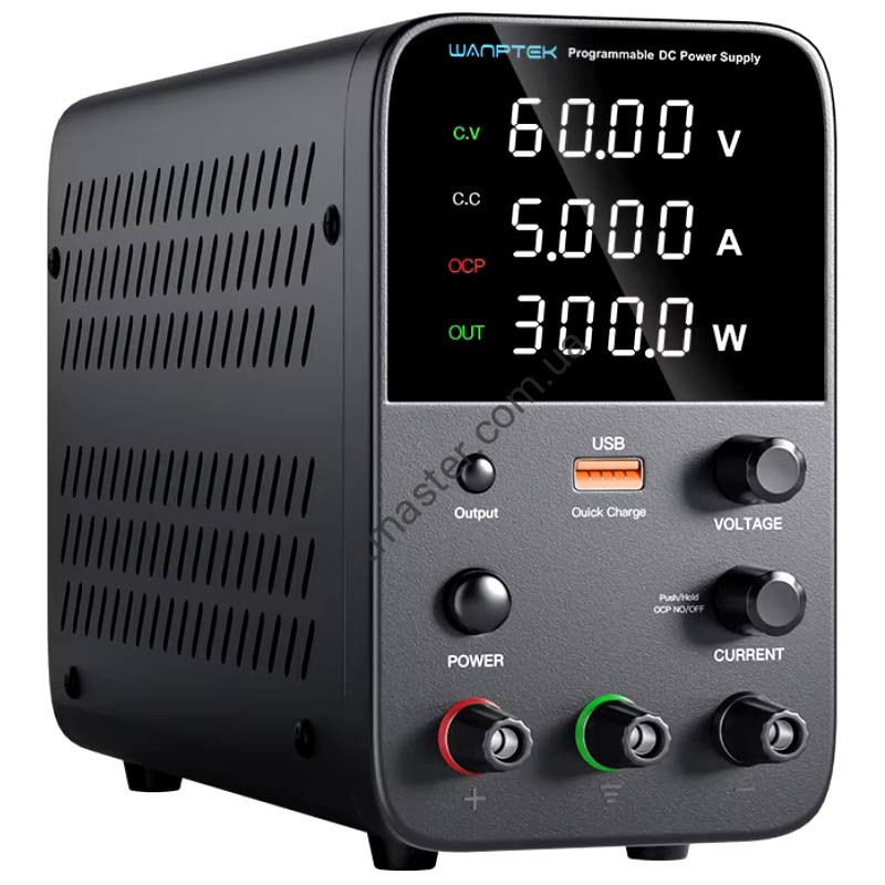 Технічні характеристики Wanptek WPS605H -Вихідна потужність: до 300 Вт -Вихідна напруга: 0~60В -Вихідний струм: 0~5A -Вхідна напруга: AC 230V/115V ±10% ; 50Hz/60Hz -Робоча температура: 0 ℃ ~ 40 ℃; відносна вологість: <80% RH -Температура зберігання: -10 ℃ ~ 70 ℃; відносна вологість: <70% RH Постійна напруга CV: -Стабільність напруги: 0,1% ± 3 мВ -Стабільність навантаження: 0,2%±3мВ -Пульсація напруги: ≤0,5% Vp-p -Від 0 до номінальної напруги безперервно регулюється Постійний струм CC: -Стабільність струму: 0,1% ± 3 мА -Стабільність навантаження: 0,2%±3мА -Пульсації струму: ≤0,5% Vp-p -Час відновлення: ≤500μS -Температурний коефіцієнт: ≤100ppm/℃ -Плавне регулювання від 0 до номінального струму -Вбудований вентилятор охолодження: є -Робоча температура: від 0°С до 40°С -Відносна вологість: < 80% -Захист: від перенапруги, перевантаження по струму, короткого замикання, перегріву -Допоміжні функції: порт USB-A з підтримкою швидкого заряджання 18W-Габарити: 190(210 з ручками) х 93 х 150мм -Вага: 1,15 кг