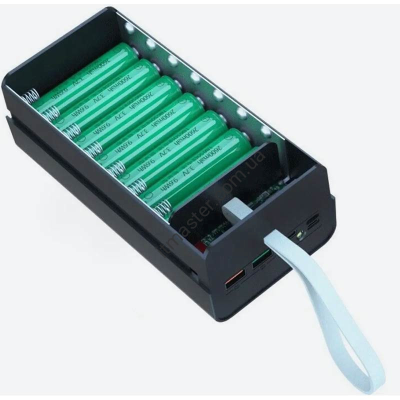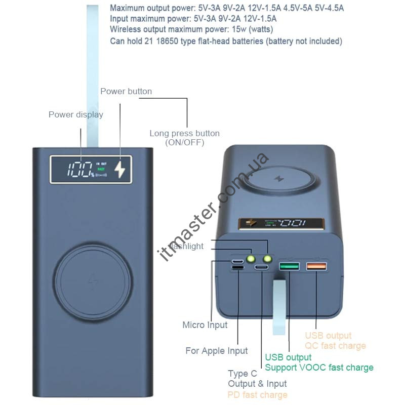 Корпус Power Bank T21-PD-QI це набір для складання портативного повербанка на 21 акумулятор 18650, сумарною ємністю до 72000 мАг. (акумулятори до комплекту не входять) При установці акумуляторних батарей (АКБ) необхідно дотримуватися полярності.