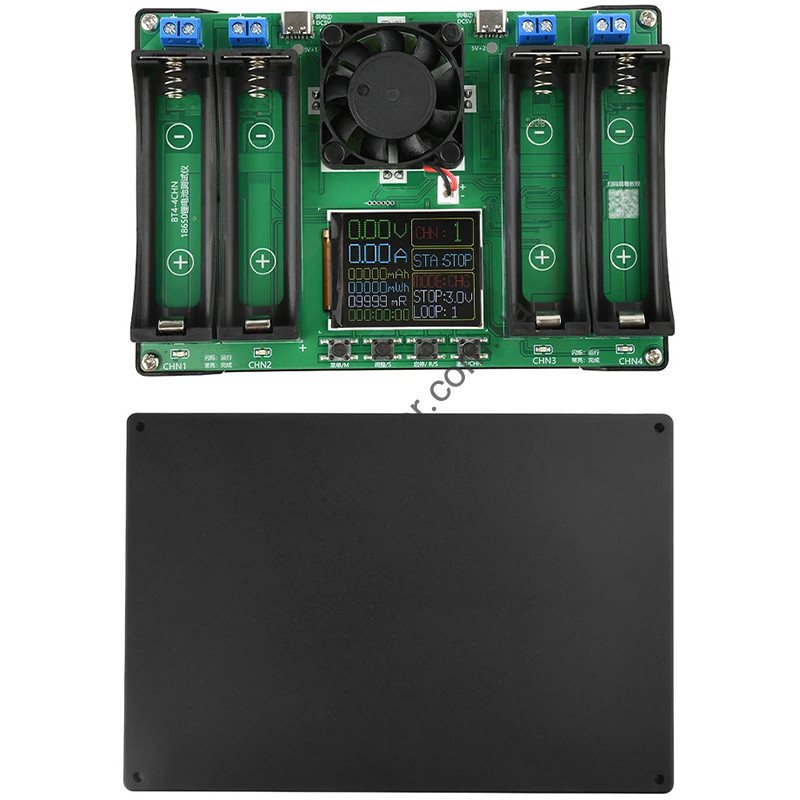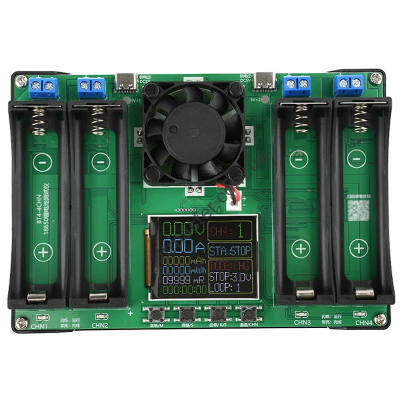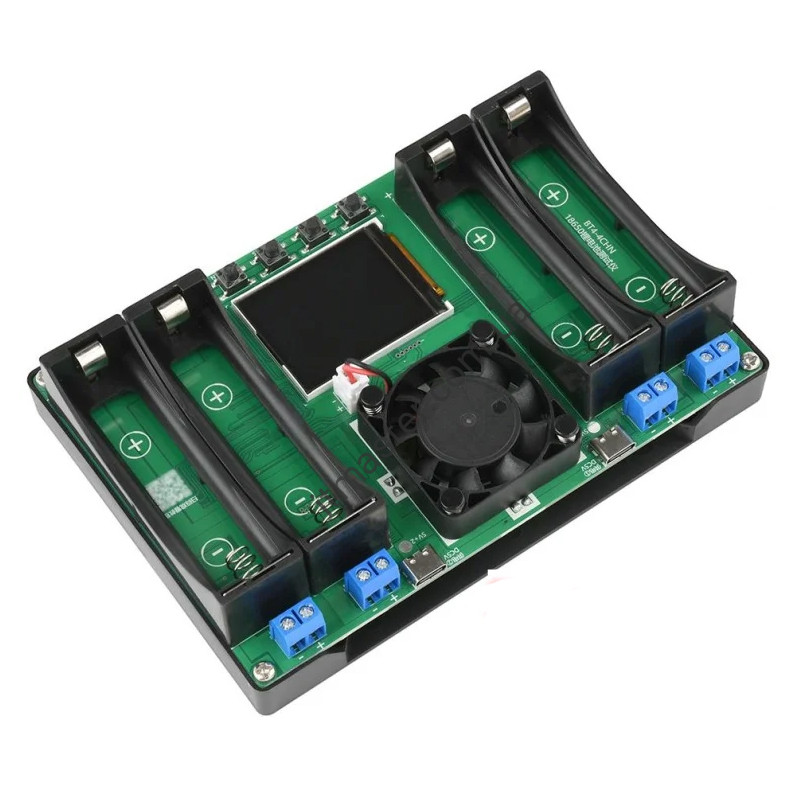 Пристрій підтримує вимірювання внутрішнього опору та ємності одночасно для чотирьох батарей, можливість роздільного заряджання та розряджання, а також автономну роботу кожного з 4 каналів. Вбудований вентилятор здатний запобігти перегріванню компонентів керування, а кольоровий РК-дисплей покаже важливі параметри процесу. Зверніть увагу: Літій-залізо-фосфатні АКБ (LiFePO4) не підтримуються. Також до використання підходять АКБ тільки з плоскими контактами.