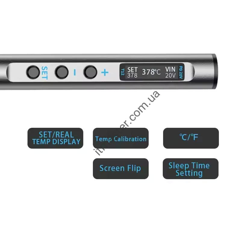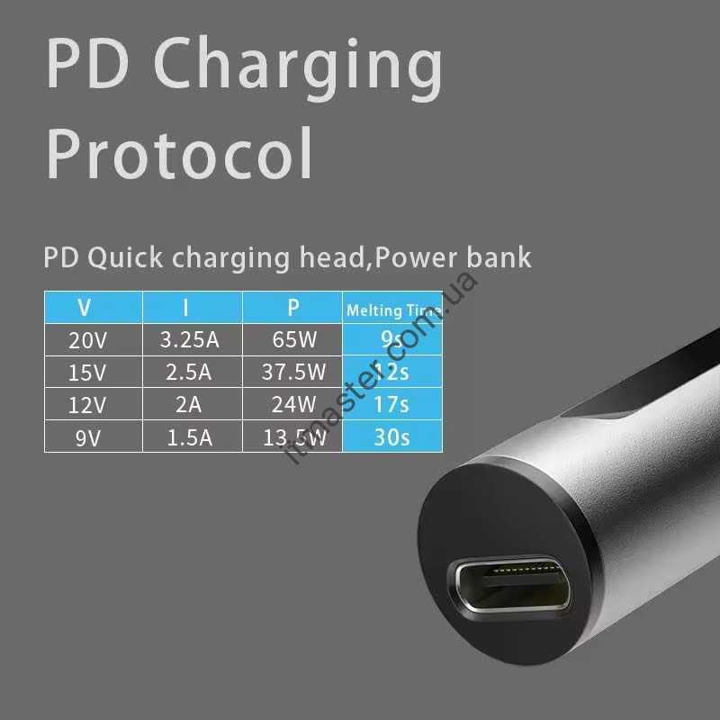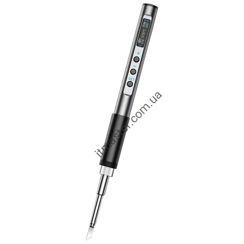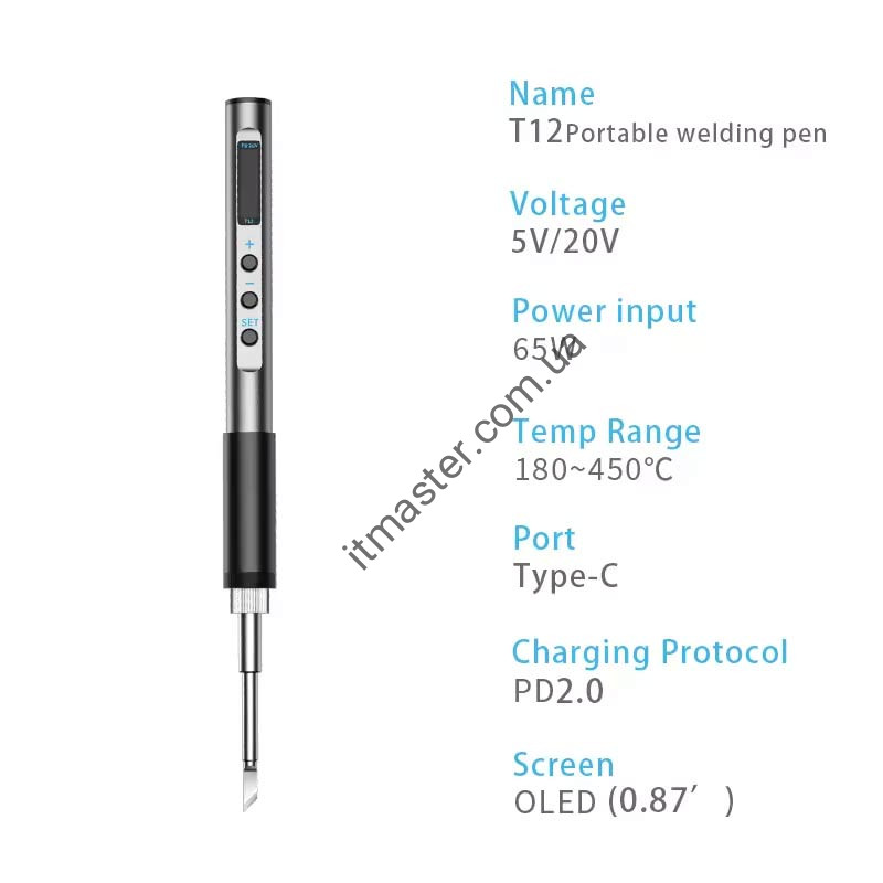 Характеристики: Протокол живлення: PD2.0 / QC3.0 Вхідний інтерфейс:USB Type-C Потужність: PD 65 Вт макс. Робоча напруга: 9-20В Діапазон регулювання температури: 180-450 ℃ Одиниця виміру температури: ºF / ºC Точність контролю температури: ±2 градуси Розмір корпусу: довжиною 230 мм (включаючи довжину жала) та 17.5 мм у діаметрі Вага ручки: 60 г. Заявлена потужність та швидкість нагрівання залежить від характеристик джерела живлення.
