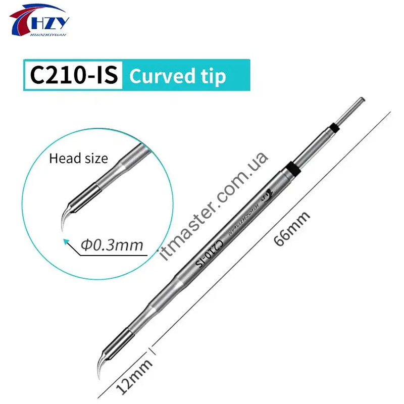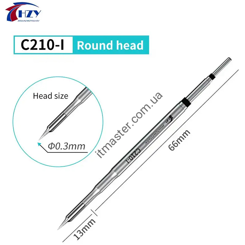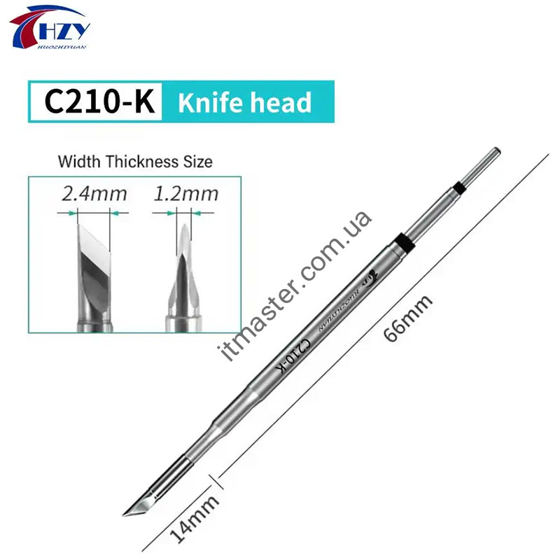 Технічні характеристики: Тип жала: C-210/HS02B Виробник: HZY Модель: C210-K, SK, I, IS Потужність: до 100Ват Максимальна напруга: 24В Робоча температура: до 400°C Термодатчик: термопара Довжина жала: 80мм