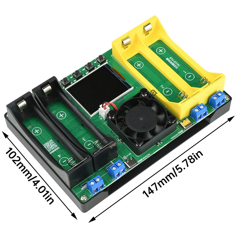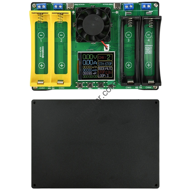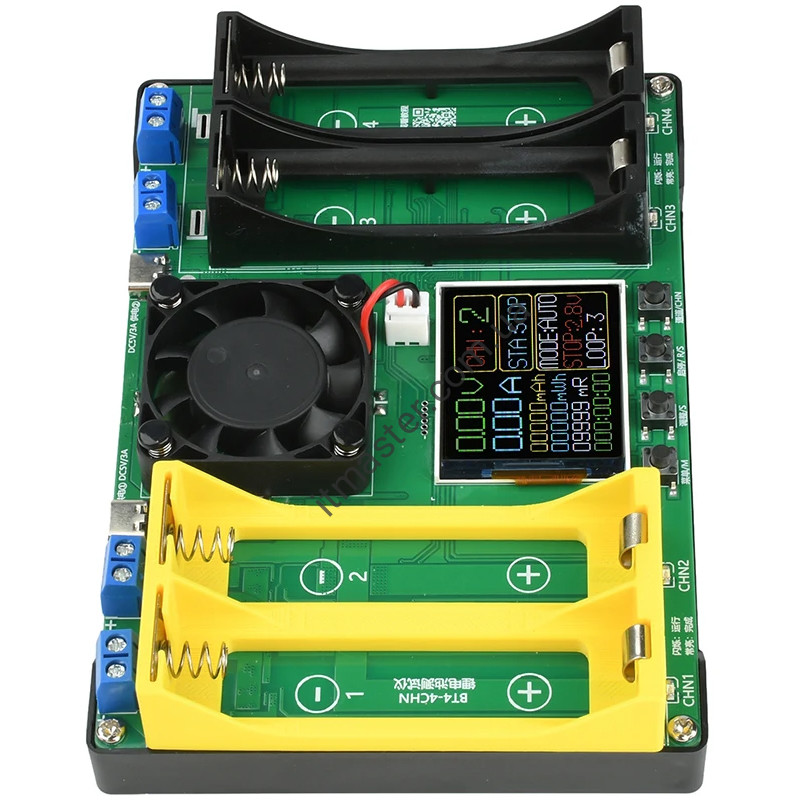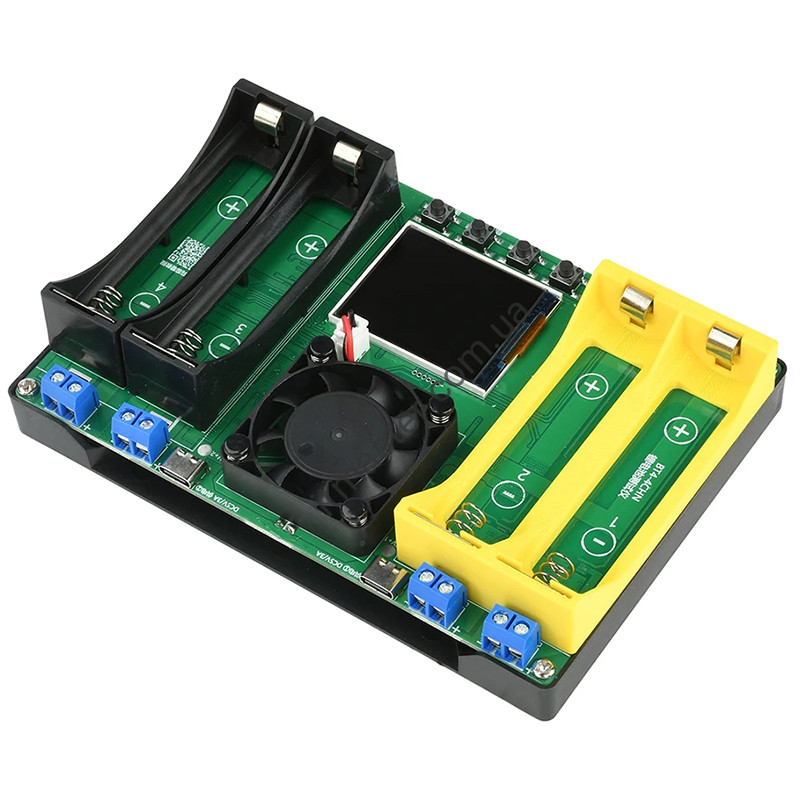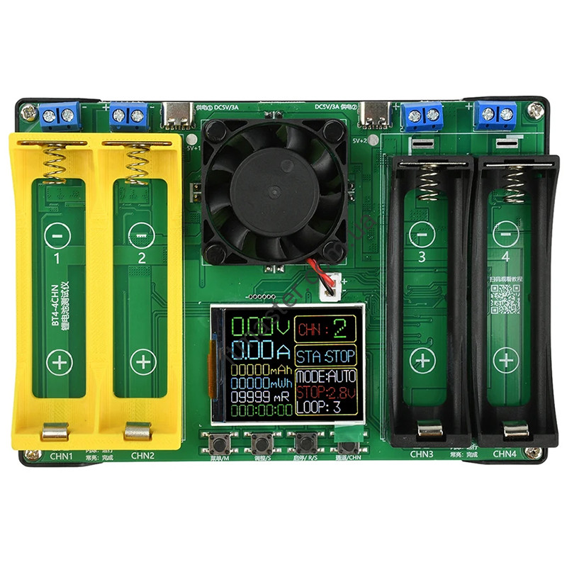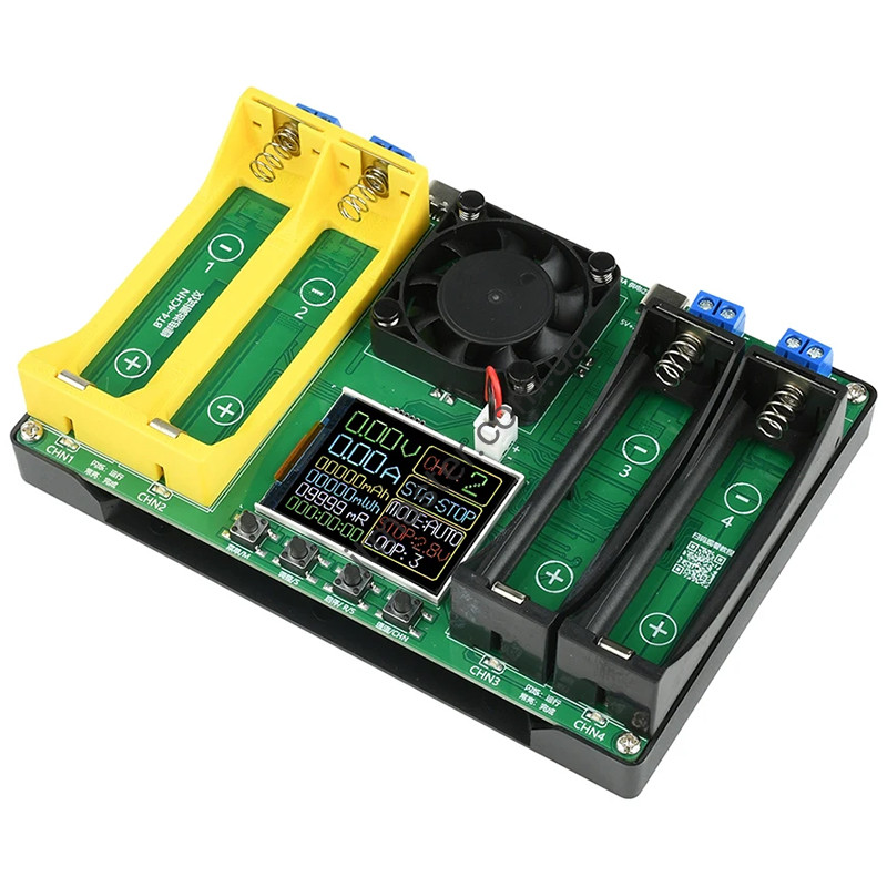 Багатофункціональний тестер для тестування акумуляторних батарей форм-фактора 18650/21700. Пристрій підтримує вимірювання внутрішнього опору та ємності одночасно для чотирьох батарей, можливість роздільного заряджання та розряджання, а також автономну роботу кожного з 4 каналів. Вбудований вентилятор здатний запобігти перегріванню компонентів керування, а кольоровий РК-дисплей покаже важливі параметри процесу. Зверніть увагу: Літій-залізо-фосфатні АКБ (LiFePO4) не підтримуються. Також до використання підходять АКБ тільки з плоскими контактами.